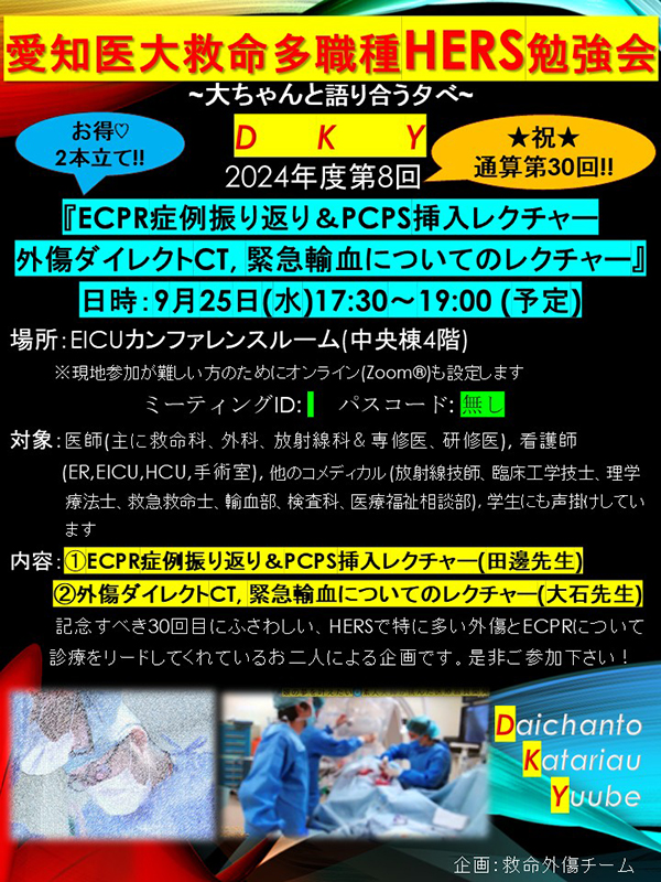 全国の外傷外科医、集中治療医の皆さん、愛知医大救命で一緒に重症外傷診療に取り組みませんか?ともに戦ってくださる仲間を常に募集しています。いつでも気兼ねなくご相談ください!