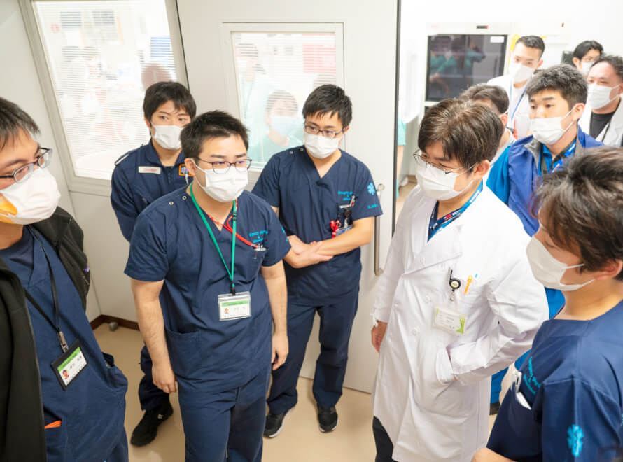 ACS(acute coronary syndrome)などは循環器内科医と協力し、脳卒中なども脳神経外科医と協力し引き続き救命救急科医師により集中治療室で治療を行っております。
